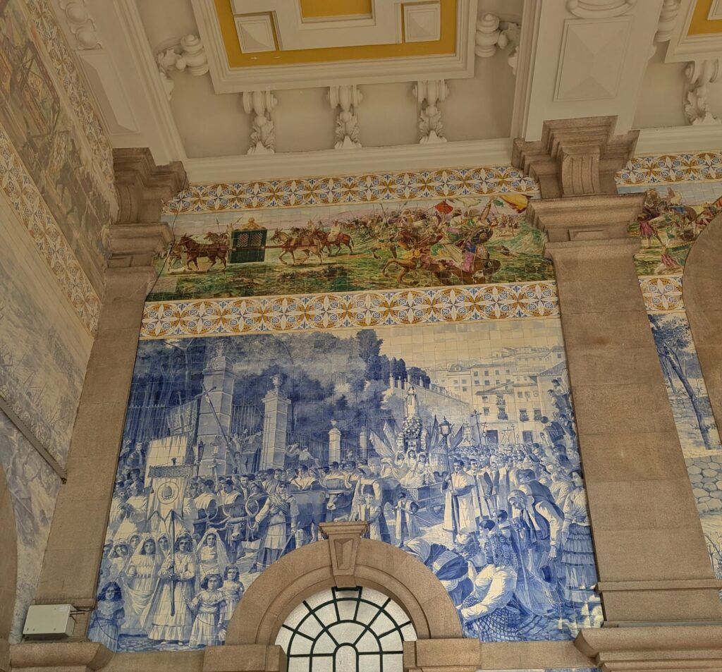 Die etwa 20.000 blau-weißen Azulejo-Fliesen wurden 1915/1916 von Jorge Colaço entworfen und bemalt. Sie zeigen historische Darstellungen, aber auch Szenen aus dem Alltagsleben.