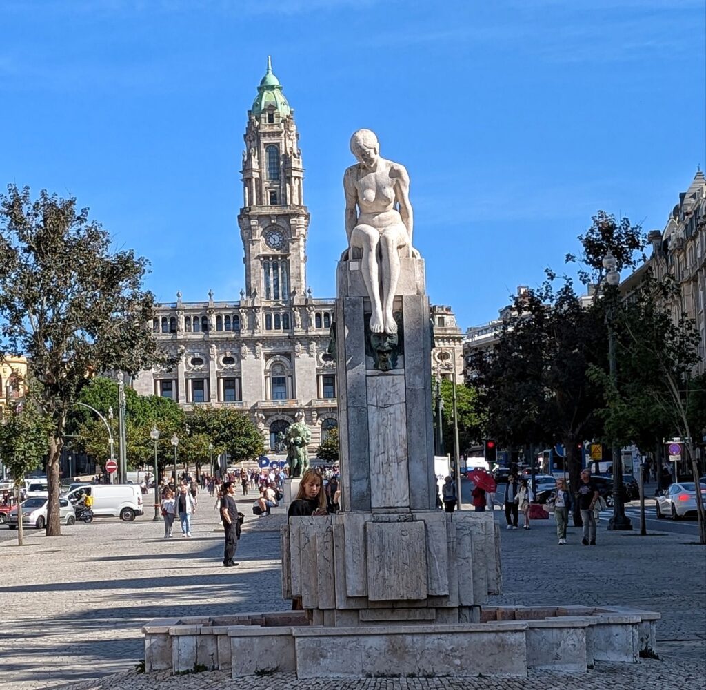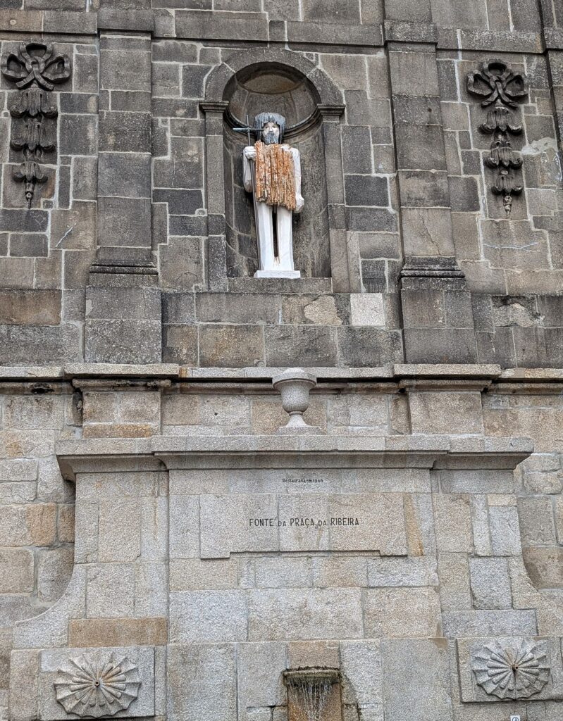 Wenn ich fotografiere, achte ich immer auch auf kleine Besonderheiten. Daher stach mir diese modern wirkende Figur über dem Brunnen Fonte da Praça da Ribeira ins Auge.
